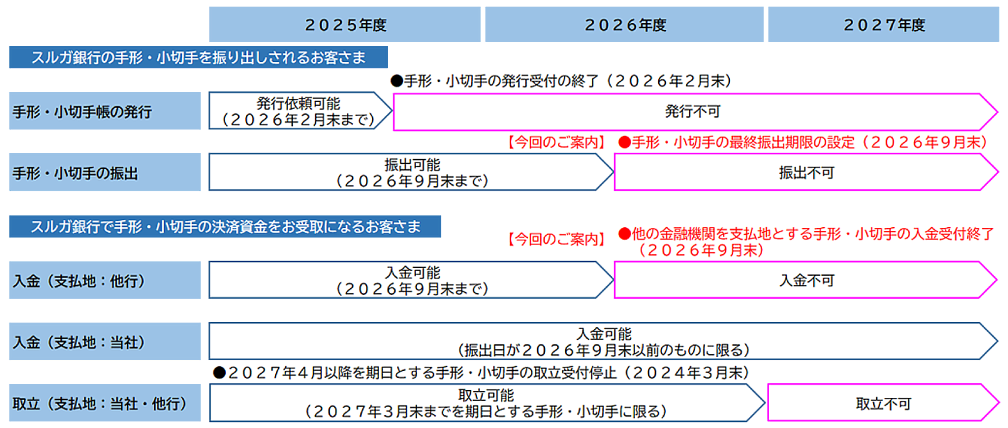 本件に伴い、「当座勘定規定」「当座勘定規定(専用約束手形口用)」「当座勘定規定(パーソナルチェック用)」「代金取立取扱規定」を2026年10月1日以降、順次改定します。改定内容の詳細は、別途お知らせします。